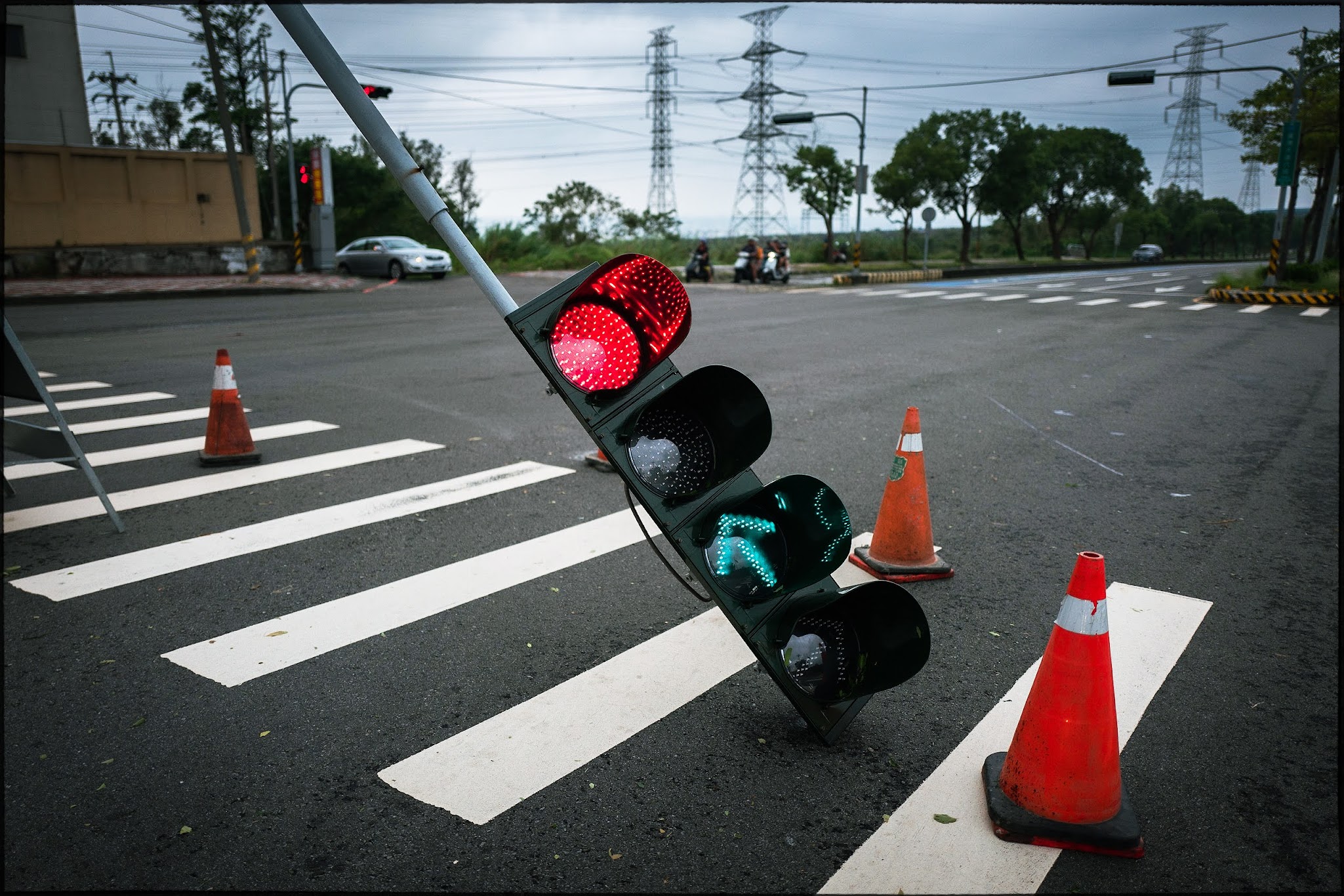 風雨中整個城鎮都停電,我到街上晃悠,看到台電搶修車來到一處著火的樹旁。我沒有雨衣,只能用衣服稍微遮住相機。